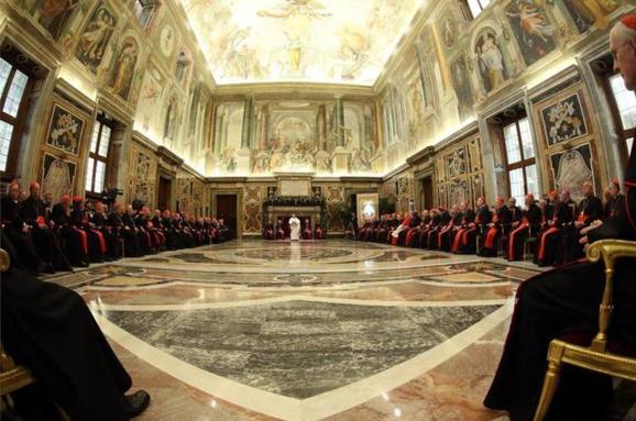 Catholic leader tells stony-faced cardinals, bishops and priests of church’s ’15 ailments’ in unusual address.