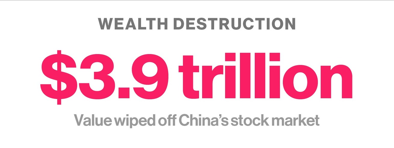 "The Shanghai Stock Exchange Composite Index has lost 28 percent since its peak on June 12, the worst selloff in two decades. About $3.9 trillion in market valuation has evaporated, more than the total annual output of Germany—the world’s fourth-largest economy—and 16 times Greece’s gross domestic product. The benchmark is still up 82 percent in the past year, the most among the world’s major markets."
